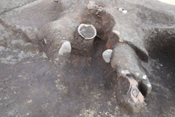 1月からの調査は、3区と4区を開始し、竪穴建物9棟、復旧坑27基、柱穴や土坑等を調査しました。竪穴建物は、古墳時代後期(7世紀)から平安時代前期(9世紀)のものが確認できています。192号竪穴建物(写真1)は、奈良時代末期から平安時代初期の竪穴建物です。長辺約4m、短辺約3mの横長長方形で、カマドが北東壁に設置されていました。カマドの燃焼部からは、土師器の甕が完形で出土しました(写真2)。復旧坑(天明3年(1783)の浅間山の噴火に伴うAs-A軽石を廃棄した穴)の形状の多くは、長方形の土坑でしたが、井戸や貯蔵用施設のために掘り込まれた穴を利用したものもありました。21号復旧坑(写真3)は、東西約5m、南北約4mの楕円形で、深さが約2mありました。下に降りるためのスロープが設置されていたことや底面に礫が集中していたことから、浅間山の噴火以前は、貯蔵用の室か礫を廃棄するための穴として使用していたと思われます(写真4)。その後、大量に降り積もったAs-A軽石を廃棄するのに利用したものと思われます。