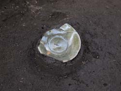 写真1は、古墳時代前期の64号竪穴建物の貯蔵穴です。周りに径1㎝~3㎝程度の小礫が敷き詰めてありました。写真2は、奈良時代の88号竪穴建物から出土した緑釉陶器です。緑が鮮やかな輪花椀です。写真3は、平安時代の66号竪穴建物から出土した鉄製の紡錘車です。紡錘車は糸を紡ぐための道具です。3つ一緒に出土しました。写真4は、平安時代の土坑から完形で出土した馬の轡(くつわ)です。轡は、馬を制御する為に馬の頭に装着する鉄製の馬具です。集落遺構から出土することはめずらしいことです。