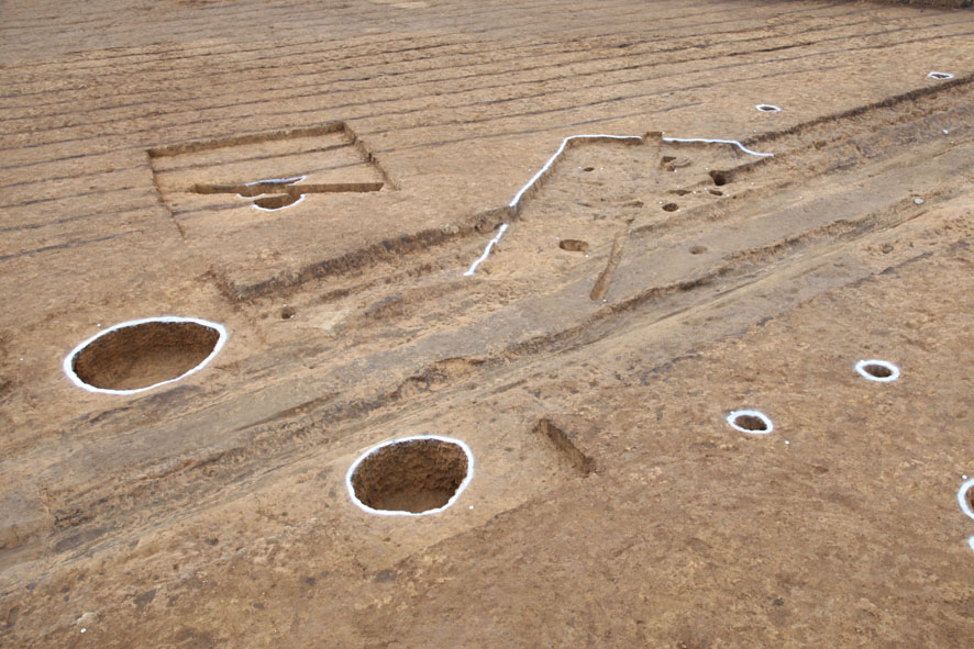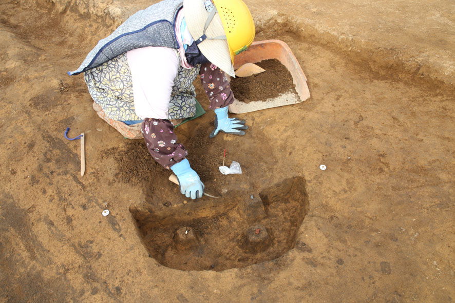 調査地東4区では、中央東側の調査に引き続き西側の調査をおこない、縄文時代前期竪穴建物と貯蔵穴タイプの土坑が確認されました。このほか、西側の県道脇でも土坑数基が確認されています。旧石器調査ではAs-BP下で剥片が出土し、調査継続中です。