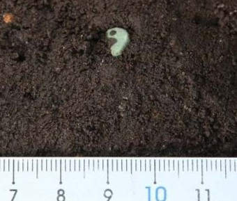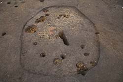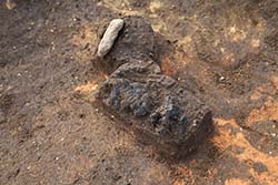 弥生時代中期の竪穴建物(写真1)の調査を行いました。多くの土器片とともに小型の勾玉(写真2)が見つかっています。竪穴建物中央付近の赤くなっている部分は炉(写真3)です。この炉の周辺からは多数の炭化物(写真4)が出土しました。