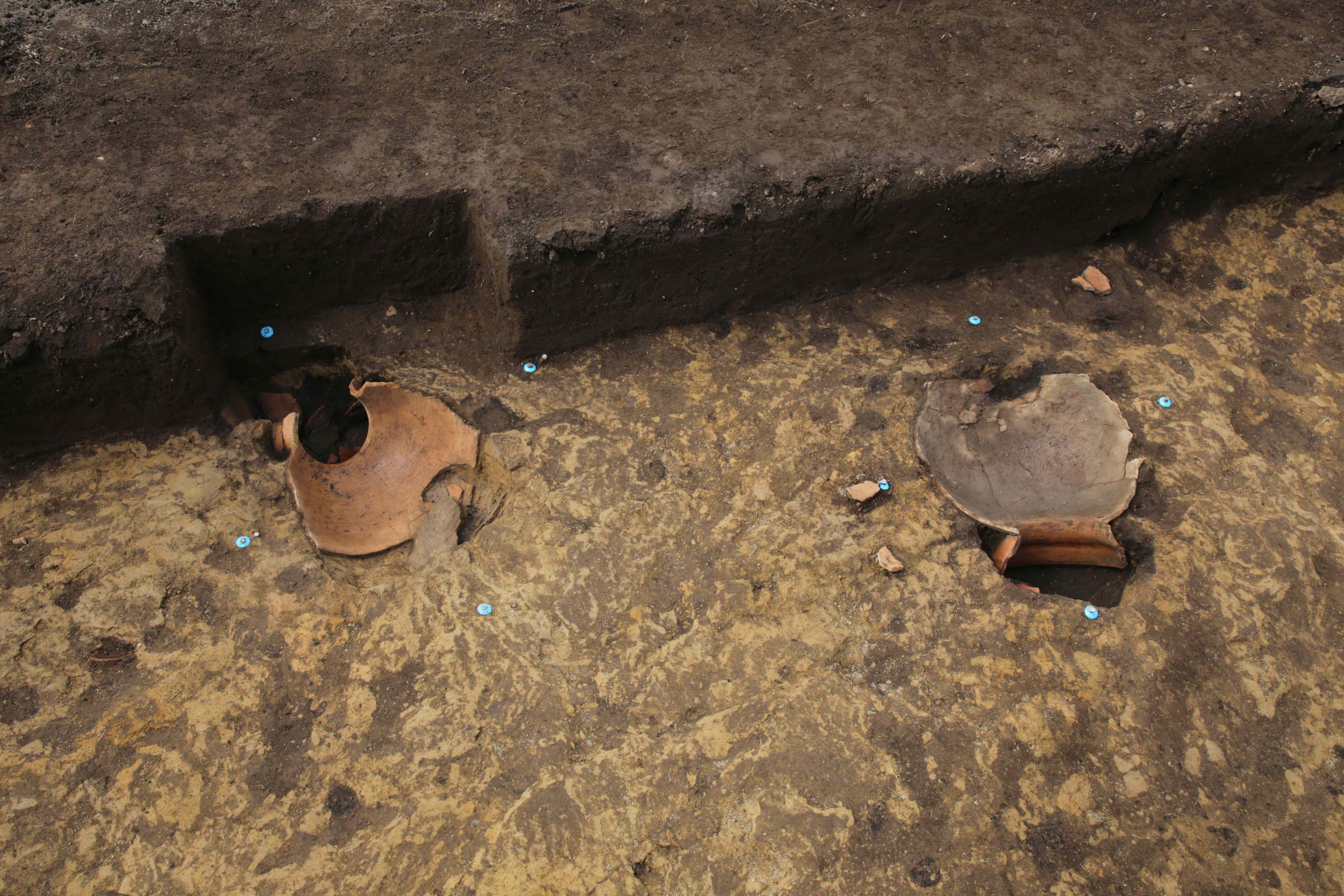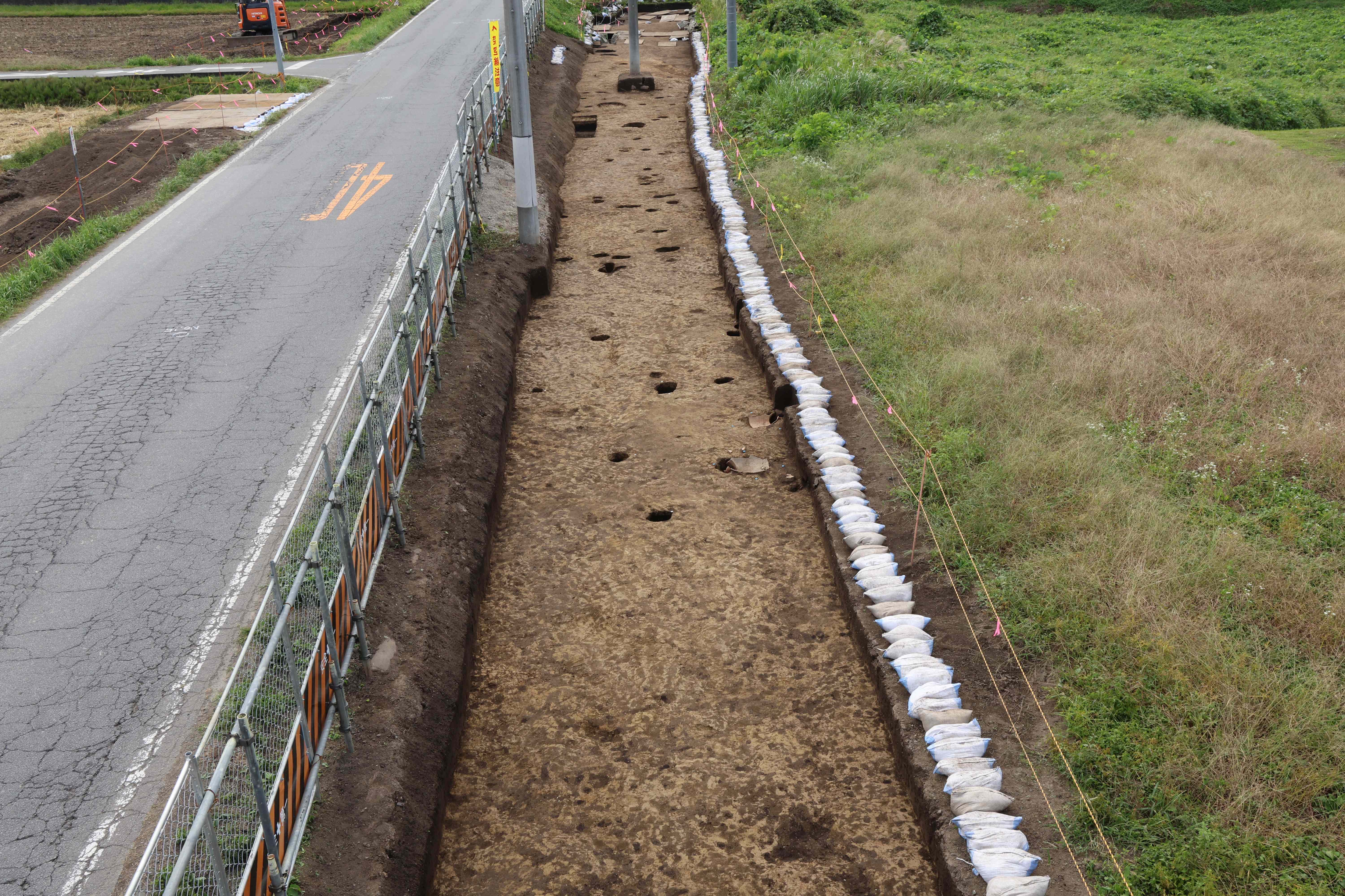 小渕沢B遺跡の2区から調査を開始し、1128年に噴火した浅間山の火山灰(As-Kk)と想定される火山灰の混じった土で埋もれた溝・土坑・ピットや、6世紀初頭にあった榛名山の噴火に伴う火山灰(Hr-FA)に直接埋もれる形で出土した大型の壺などが見つかっています(写真1・2)。現在は植栗中原遺跡の5・6区の調査を進めており、As-Kk混土で埋まったピットや土坑などが検出されています。令和元年度に行われた隣接する周辺遺跡の調査では、複数の竪穴建物や古墳も検出されており、今後も新たな発見が期待できます。