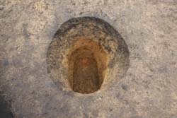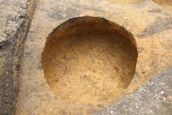月夜野A遺跡は、榛名山北麓を流れる泉沢川によって開析された段丘上に立地し、標高は約370mです。令和5年度の発掘調査では、縄文時代早期から前期にかけての竪穴建物が20棟以上見つかっています。今回の調査は、その集落から少し離れていたためか竪穴建物は見つかりませんでしたが、貯蔵穴と考えられるフラスコ状の土坑(写真1)や陥穴と考えられる土坑(写真2)などが見つかりました。調査は終了しました。