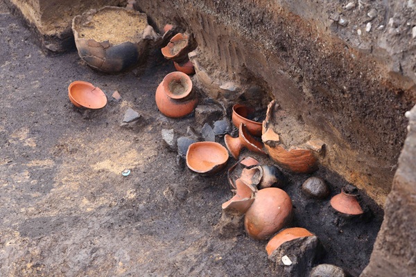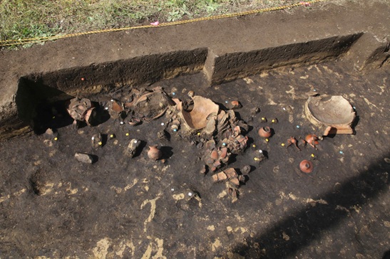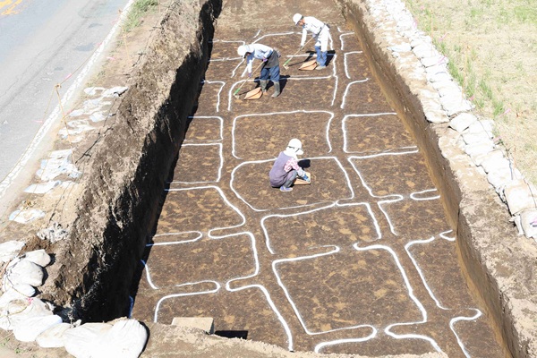 小渕沢B遺跡では、前回紹介した6世紀初頭の榛名山の噴火に伴う火山灰(Hr-FA)に埋もれた大型の甕の下からさらに高坏や臼玉、鉄製品など、当時祭祀などで使われた遺物が多数出土しました(写真1)。また、今月より調査を開始した植栗山根A遺跡3区からも祭祀関係の遺物が集中して見つかっています(写真2)。そして、植栗中原遺跡の5・6区からは、このHr-FAの下から当時の水田が出土しました(写真3・4)。水田は非常に残存状態がよく、当時の耕作者のものと思われる足跡も確認できました。