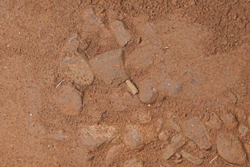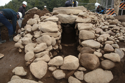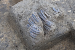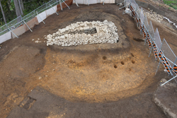 10月には2号墳の調査を継続しました。2号墳は周堀や葺石、横穴式石室を検出し、墳丘周縁からは円筒埴輪の底部が立てられた状態で出土しました。墳丘は6世紀初頭の榛名山二ツ岳の噴火による火山灰の上に盛られており、周堀から出土した土器は6世紀前半の年代を示します。また、緑色凝灰岩製の完形の管玉が石室の玄室床面で1点、側壁の裏込めから2点出土しました。古墳の近くにある14号土坑からはウマの歯が出土しました。歯の形状から幼齢馬で古墳に伴って埋葬された可能性があります。