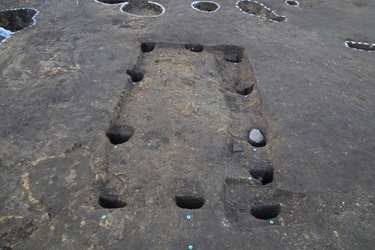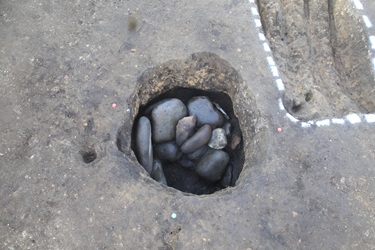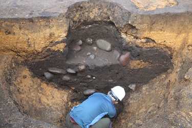先月に続いて江戸時代の遺構を中心に調査しました(写真1)。1号掘立柱建物は、長辺が約1.7mある長方形の区画内を浅く掘り窪めて、周囲に10本の柱を建てた遺構です(写真2)。69号土坑は、掘り始めた時には直径約1mの穴でしたが(写真3)、掘り進めると大きくオーバーハングする徳利のような形の穴になりました(写真4)。安中宿の屋敷内に掘られた穴倉(火事の時などに一時的に荷物を避難させるための穴)ではないかと思われます。今月で、調査は終了しました。