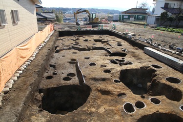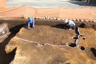 今年度は、上野尻遺跡3区の南側を調査します。今までのところ、古代の竪穴建物(写真1)と中世のピットが多数見つかっています(写真2)。