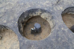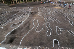 11月は、2面目(古墳時代)の調査で、溝1条と多数の線状衝撃痕が見つかりました。この衝撃痕は6世紀初頭の榛名山の噴火により発生した火砕流が地表面を筋状にけずった痕跡です。また3面目(縄文時代)の調査も始まり、貯蔵穴と考えられるフラスコ状の土坑が多数見つかりました。