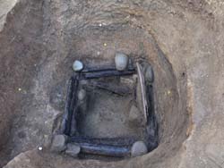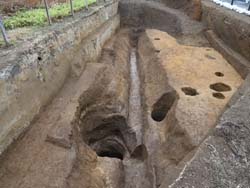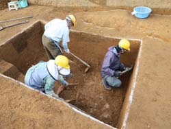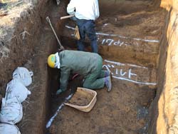 今月は、6区、9区東で旧石器確認調査を行いました。5区東では先月に調査をした東西方向の大型の溝を調査し、その溝より新しい井戸2基も調査しました。大型の3号井戸には、3段以上の木枠が残っていました。7区西では、南北方向の溝1条を調査しました。12月で調査は終了しました。