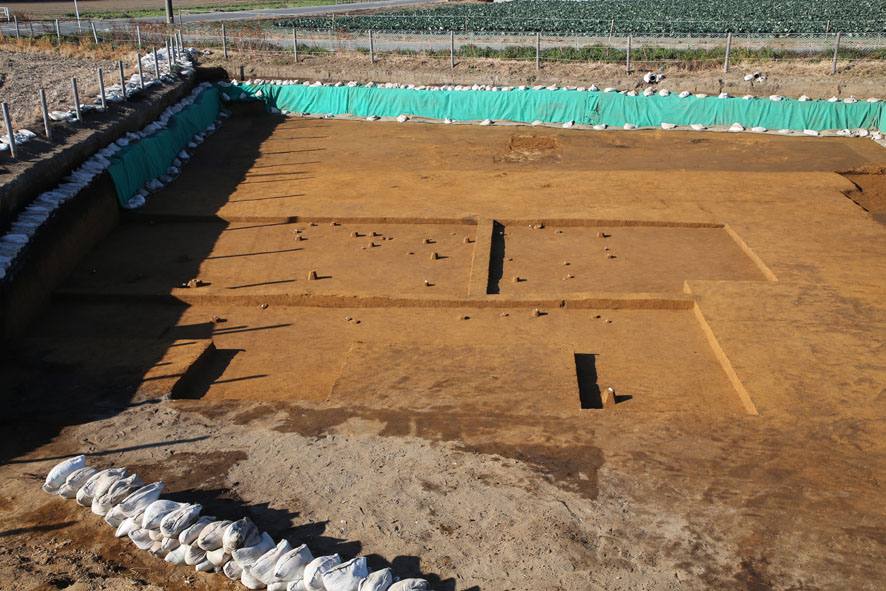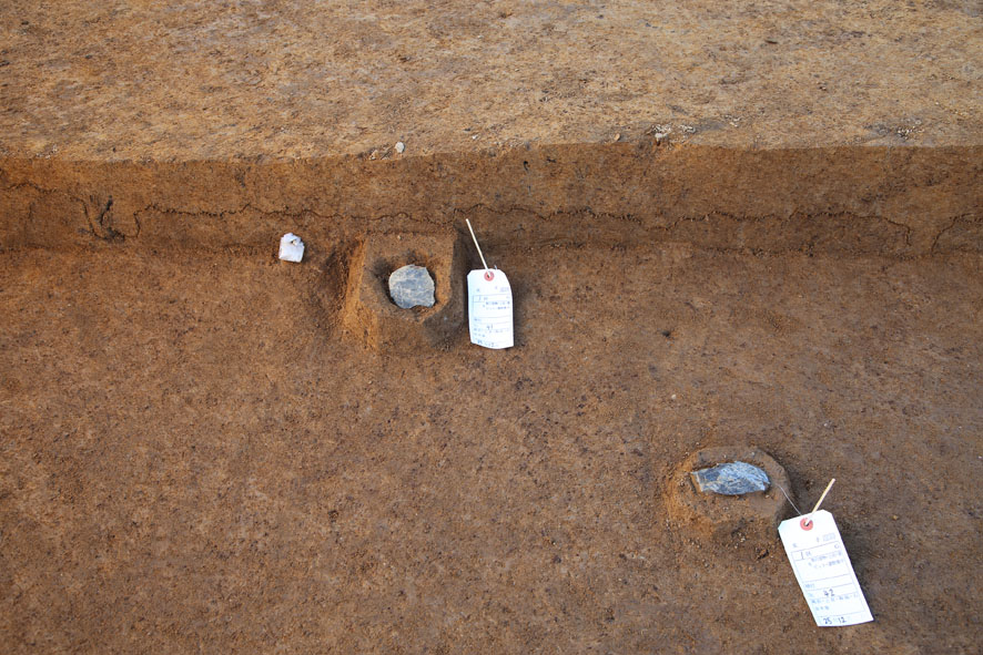 1区中央の低地部を挟んだ西側台地の旧石器調査をおこないました。この地点の旧石器分布は8月段階でわかっていましたが、水位が高く調査を中断していました。ナイフ形石器を含む剥片(はくへん)や砕片(さいへん)、大型礫など57点が出土しました。石器の分布は西側に広がることが確実なため、今後調査をする予定です。