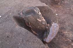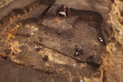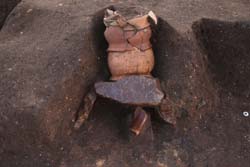 今月は珍しいカマドのある平安時代(9世紀後半)の竪穴建物を調査しました。写真1はその建物の全景です。焚き口には門のように大きな石がコの字型に組んであり、その上に底を抜いた土器を重ね、煙道が作られていました(写真2・3)。土器の中は煙道をつくるときに埋めた土が残っており、煙道の形状や造り方がよくわかります(写真4)。