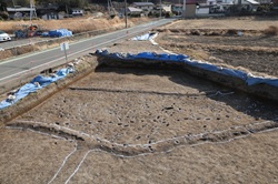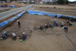 今月は11月に引き続き1区の調査を行いました。天仁元(1108)年の浅間山噴火に伴う軽石(As-B)に覆われた水田を確認しました。また、12本の畦と、人の足跡が多数見つかりました。