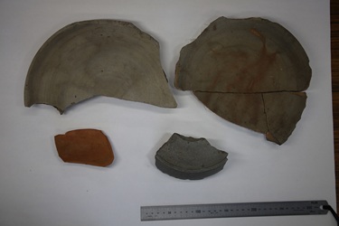 今月は、長さ約7m、最大幅約2mのトンネル状の遺構が(写真1)、飛鳥~奈良時代にかけての須恵器とともに見つかりました(写真2)。この遺構は、形状や堆積状況などの観察から、トンネル状に窯掘削する途中で天井が崩落してしまい操業を断念した炭窯ではないかと思われます。また、調査区全体では、500基を超す中世の柱穴が見つかりました(写真3)。柱穴位置等の検討から、10棟以上の掘立柱建物があったようです。最後に、旧石器時代の確認調査を実施しましたが(写真4)、遺物は出土しませんでした。調査は、今月で終了しました。