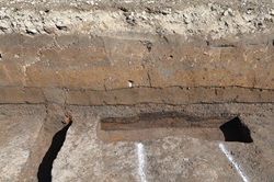 2月は1区の調査を行いました。天仁元(1108)年の浅間山噴火に伴う軽石(As-B)に覆われた水田を確認しました。水田の他に、中世の溝1条も確認しました。この溝からは14世紀ごろの青磁の碗の破片が見つかりました。また、確認した水田のさらに下にも水田の痕跡がないか、掘り下げて調査を行いました。調査は2月末で終了しました。