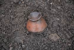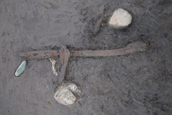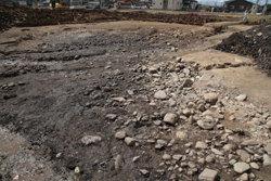 遺跡北側の1区から2区にかけて確認された自然流路で、縄文時代から中・近世の幅広い時期の遺物が出土しました。流路の底面から5世紀と考えられる台付き甕の脚部や木器、6世紀と考えられる臼玉などが確認されました。同流路は5世紀から10世紀にかけて継続的に利用されたものと考えられます。調査は3月末で終了しました。